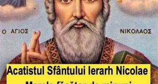 Cel care verși mir de mult preț la toată lumea, și mie, celui nevrednic și mai mult decât toți păcătos, dăruiește-mi ca să-ți aduc ție cântare, Părinte Nicolae. Tu, ca acela care ai îndrăznire către Dumnezeu, slobozește-mă din toate necazurile, ca să cânt ție: Bucură-te, Sfinte Ierarhe Nicolae, mare făcător …